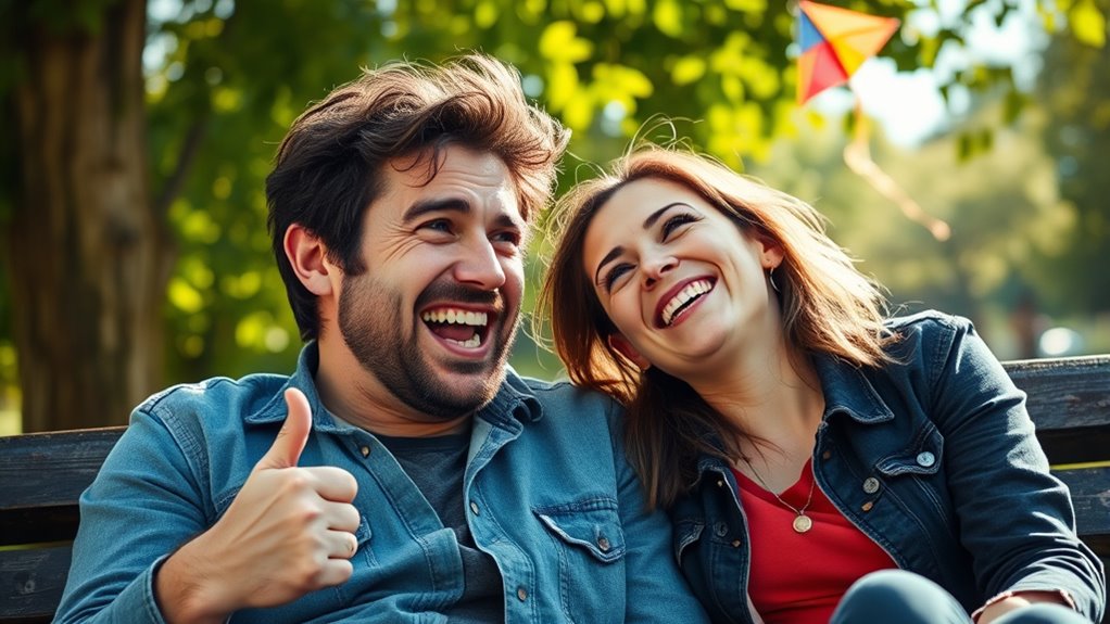 You should share humorous moments daily or at least during your date night to keep things light and fun. Incorporate silly traditions, like funny jokes or playful banter, to strengthen your bond. Regular laughter helps you both stay connected and enjoy each other’s company. By making humor a part of your routine, you create a joyful relationship where laughter becomes a natural, ongoing part of your love story.
