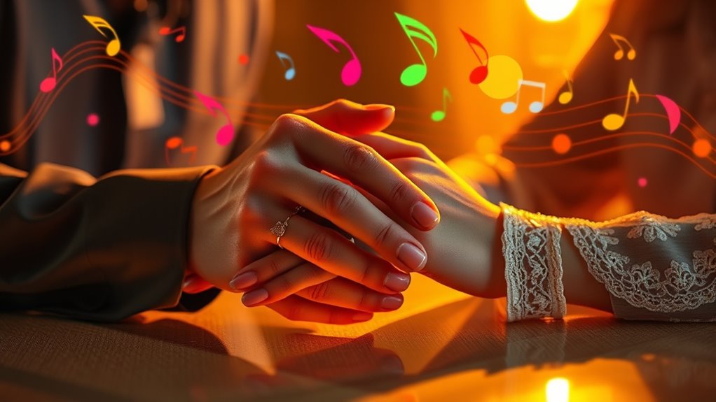 You’ll notice that romantic lyrics across languages often share common themes, like love’s emotional depth and longing. About 65% of songs use cultural symbolism or poetic metaphors to express affection, making the message more powerful. No matter where you listen, these themes highlight universal feelings—devotion, passion, and hope—that transcend language barriers, connecting listeners through shared emotional experiences.
