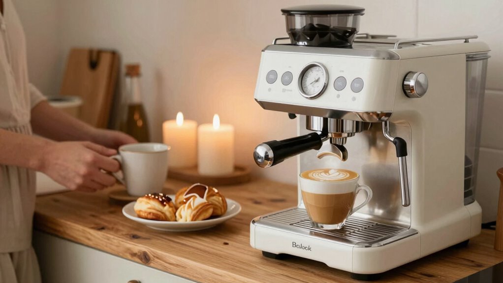 A top-quality latte machine transforms your home into a cozy, stylish space perfect for romantic evenings. It gives you control over every detail, from flavor to presentation, turning routine mornings into intimate moments. The sleek design enhances your decor and elevates your lifestyle. It fosters connection and creativity, making each sip feel like a special occasion. If you want to discover how this upgrade can truly change your home experience, keep exploring the possibilities.