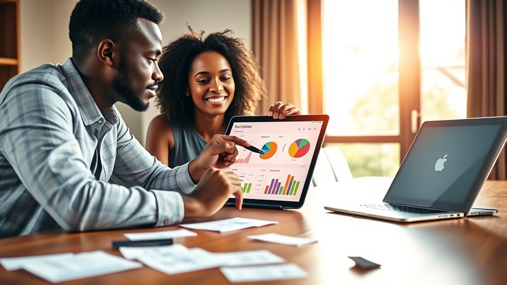 Financial transparency tools boost trust between partners by reducing communication barriers, making financial discussions clearer and more open. When you share real-time data, it minimizes misunderstandings and emotional responses that often cause conflicts. This openness encourages honesty, builds confidence, and fosters collaboration. As a result, you and your partner feel more secure and connected, knowing you’re working together with transparency and trust, strengthening your financial relationship over time.