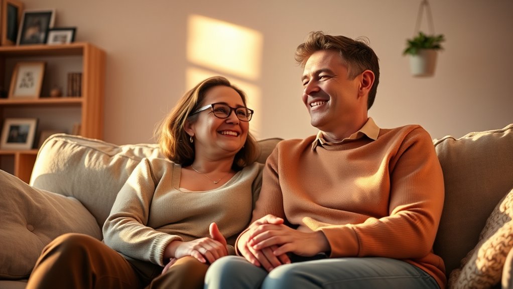 During stressful times, it’s easy to forget gratitude, but gentle reminders help. You should practice stress management techniques like mindful breathing and take time to reflect on emotional resilience strategies. Focus on small, positive moments and express appreciation for your partner’s efforts. This keeps gratitude alive, even amid chaos. Consistently nurturing these habits deepens your connection, making both of you stronger and more resilient through life’s challenges.