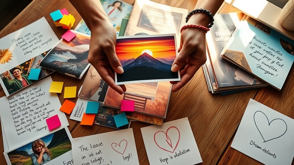 For a durable vision board, choose sturdy materials like thick poster board or foam core to guarantee longevity. Incorporate a mood board style by adding textured elements such as fabric swatches or metallic accents for visual interest. Use laminated photos or waterproof adhesive to prevent damage. This combination of material durability and mood board creativity helps your relationship goals stay inspiring and intact over time.