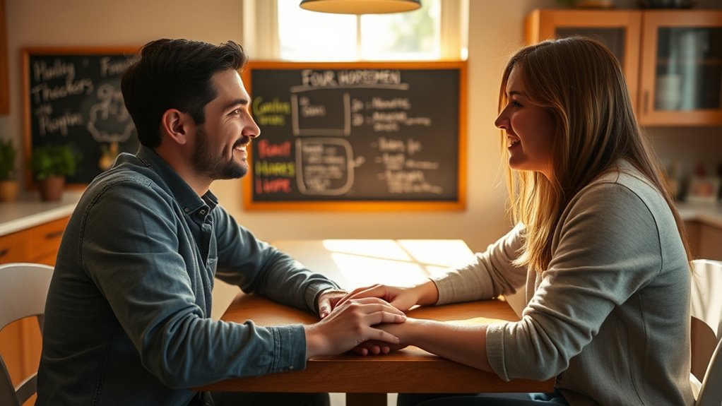 To repair communication with the Gottman “Four Horsemen,” start by recognizing these destructive behaviors—criticism, contempt, defensiveness, and stonewalling—in your interactions. Instead of reacting defensively or criticizing, pause and reframe your comments to focus on feelings and needs. Show appreciation, actively listen, and take time to calm down when needed. Developing awareness and intentional responses can transform conflicts into connection—if you continue exploring, you’ll discover effective strategies to rebuild trust and understanding.