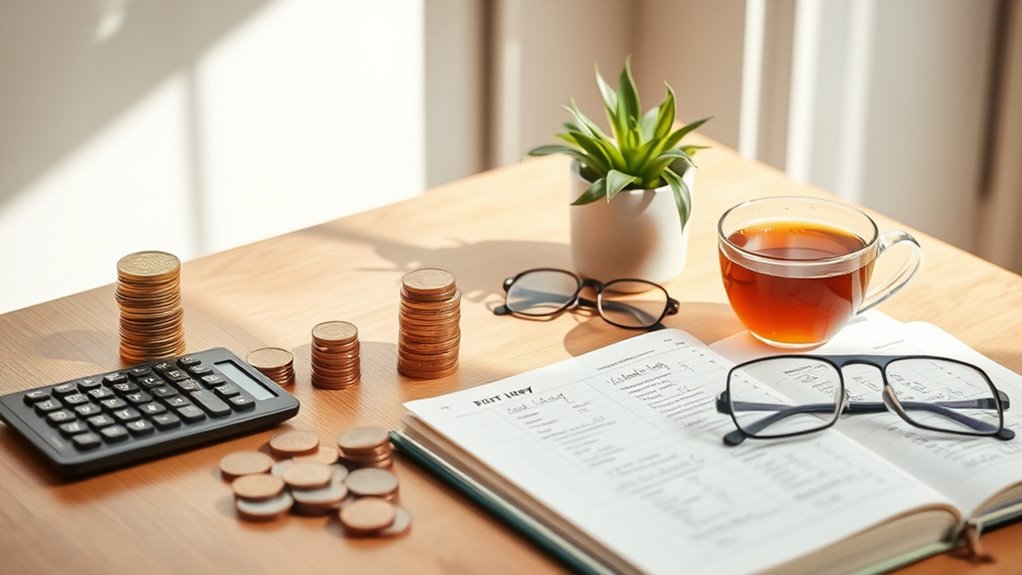 You can balance saving and enjoying life by setting clear financial boundaries that allow for emotional spending without guilt. Allocate a specific fun budget each month, so you enjoy experiences without overspending. Prioritize your savings goals, but remember to indulge occasionally, making it part of your self-care routine. This way, you maintain a healthy financial balance, reduce stress, and ensure you’re nurturing your well-being while still having fun.