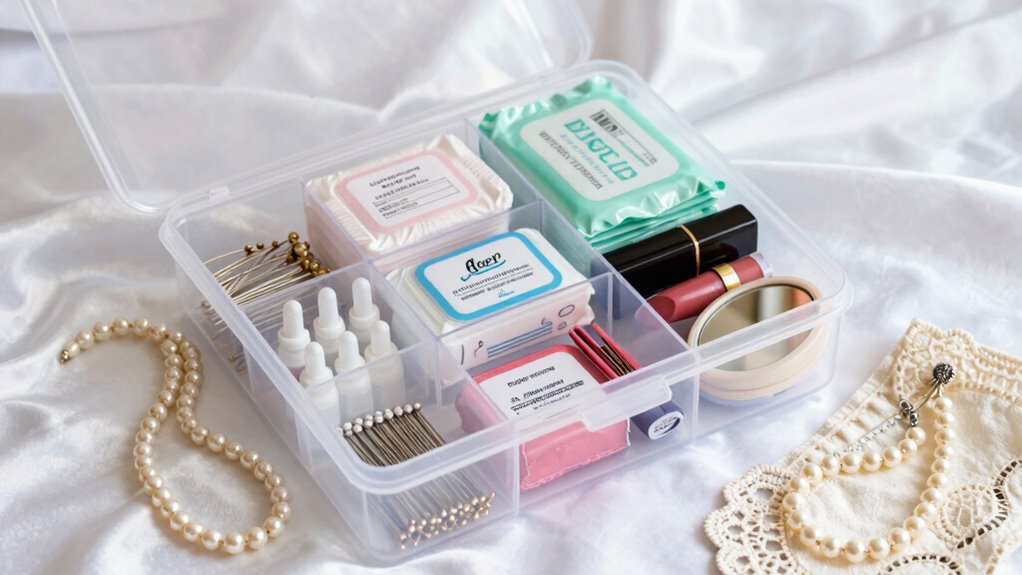 Selecting the right items for your bridal emergency kit is only part of the equation—how you carry it matters just as much. You want a kit that fits comfortably in your handbag, clutch, or travel bag, so it’s accessible without adding bulk. Opt for lightweight, compact designs that won’t weigh you down or interfere with your busy schedule. Check if the size allows easy access to all contents—there’s no point in unpacking half the kit just to find a safety pin. Portability features like a sturdy handle or secure zipper are essential for quick retrieval and safe storage. The goal is to find a size that balances all-encompassing coverage with convenience, so you’re prepared without carrying unnecessary bulk.