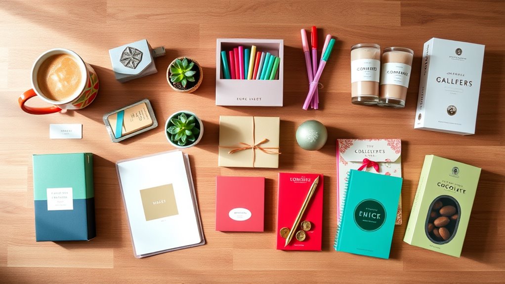 Unique designs can make a gift truly stand out and show that you’ve put thought into it, which is especially important when working with a budget. Creative patterns and themes can reflect different personalities and office environments, making your coworker feel seen and appreciated. Incorporating distinctive visuals or quirky quotes adds humor and personality, making the gift more memorable. Personalization options, like custom engravings or monograms, boost originality and show extra effort. Uncommon design elements—think unusual shapes or artistic details—turn a simple gift into something special without breaking the bank. When choosing a gift with a unique design, focus on something that resonates with your coworker’s style or interests. This thoughtful touch ensures your gift will be both appreciated and remembered.