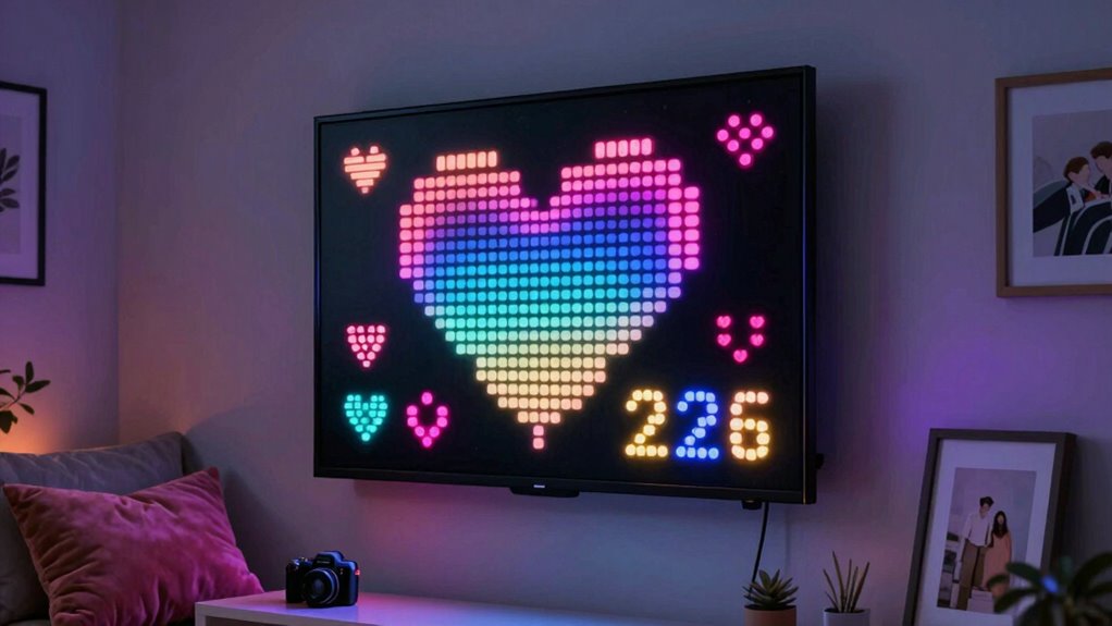 The design and aesthetic appeal of LED message boards play a crucial role in making your love notes stand out. I find that choosing a board that complements the decor, whether modern, minimalist, or playful, instantly enhances the overall look. Vibrant LED colors and dynamic lighting modes make messages pop and grab attention. The shape and size should match the space, like compact options for desks or larger ones for walls. High-quality materials such as acrylic or tempered glass give a sleek, stylish vibe while ensuring durability. Personalization options, including color choices, modes, and frame styles, allow me to tailor the display to my mood or theme. Ultimately, a visually appealing design elevates the love notes, making them more meaningful and memorable.