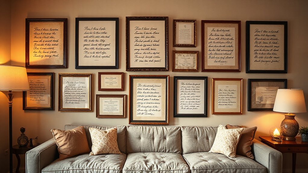 The size and frame of your love song lyric wall art play a significant role in how it enhances your space. Choosing the right size guarantees your piece complements the room without overpowering or seeming too small. Larger frames work well as focal points, drawing attention, while smaller sizes fit nicely in gallery walls or as accent pieces. It’s important to contemplate your wall’s dimensions and select a standard size, like 8×10 or 16×20 inches, that fits comfortably. The frame style and color can further elevate the artwork, either matching your decor or adding a pleasing contrast. For unique spaces, custom sizing offers a tailored fit, ensuring your love song lyric art perfectly suits your space and personal style.