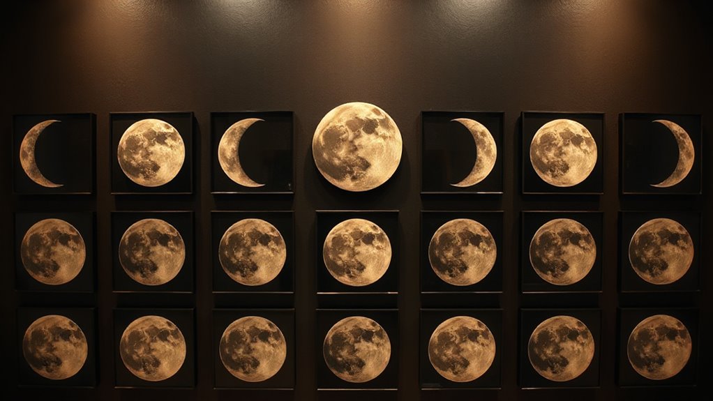 Selecting the right size for moon-phase wall art is essential to create a balanced and visually appealing display. I always start by measuring the wall space where I plan to hang it, ensuring the piece fits proportionally without overwhelming the room or getting lost. Larger artworks make bold focal points, while smaller ones work better as accents or in grouped arrangements. I also consider how the size relates to other decor elements to maintain harmony and prevent clutter. Think about how far away viewers will be; bigger pieces are more impactful from a distance, while smaller pieces invite closer inspection. Choosing the right dimensions ensures your moon-phase art enhances the space without overpowering it, creating a truly engaging display.