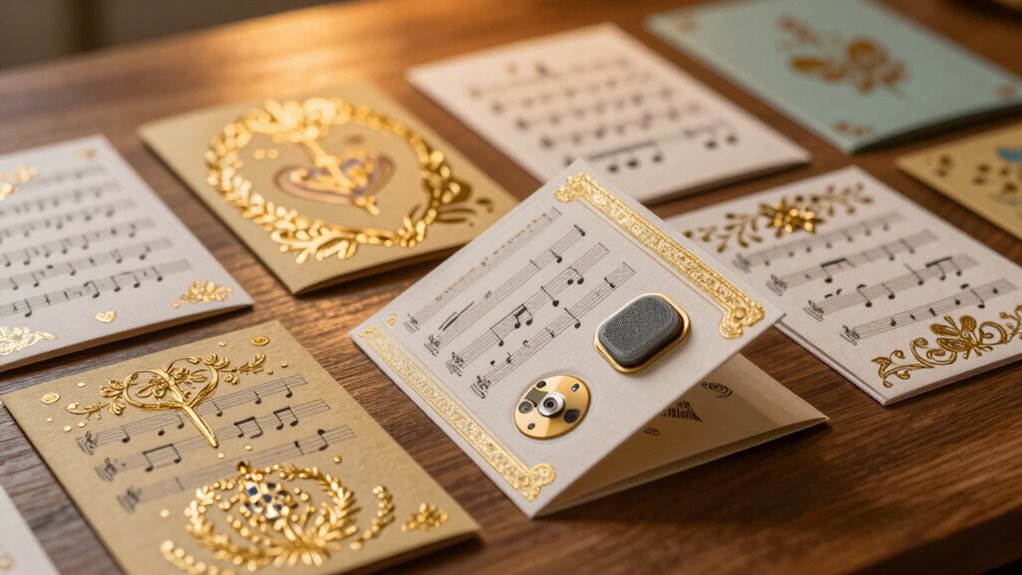 Choosing the right love songs for musical greeting cards requires a diverse selection that appeals to different tastes and emotional tones. I look for a mix of classic favorites, contemporary hits, and personalized options that add sentimental value. Including various genres like ballads, jazz, and pop helps recipients connect more deeply with the music. Offering multiple song choices within a single card makes it easy to customize for different occasions or personal preferences. This variety also creates a more interactive experience, allowing the recipient to switch or select songs that resonate most with their feelings. By providing a broad range of options, I guarantee that the musical greeting card can genuinely reflect the unique relationship and emotional depth I want to express.