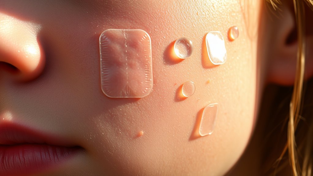 Choosing the right active ingredients in pimple patches can make a real difference in how effectively they treat blemishes. Hydrocolloid is the main ingredient, absorbing excess oil and pus, creating a moist healing environment, and preventing picking. Some patches include added ingredients like tea tree oil or salicylic acid, which provide antimicrobial and anti-inflammatory benefits, targeting bacteria and swelling for faster results. When selecting patches, it’s important to take into account your skin type; for sensitive or acne-prone skin, look for options with gentle ingredients to minimize irritation. Active ingredients can enhance healing, reduce inflammation, and tackle specific skin concerns. By choosing patches with suitable active ingredients, you can improve your skincare routine and see clearer, calmer skin faster.