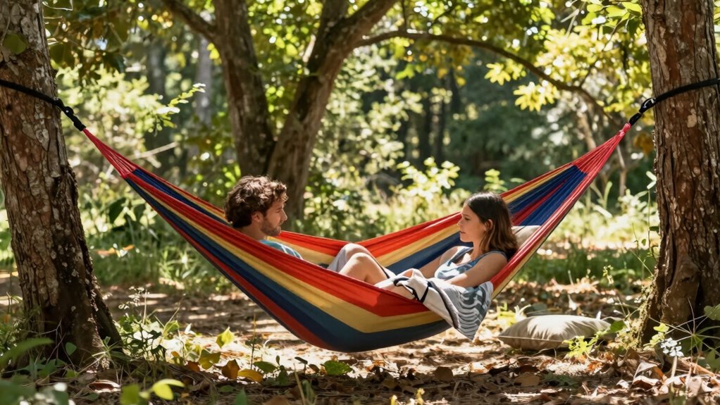 Versatility is a key factor when choosing a portable hammock for couples because it determines how easily you can adapt it to different environments and activities. Adjustable straps and multiple setup options allow you to hang it between trees, on stands, or indoors. Many models include accessories like carabiners, spreader bars, or portable stands, which boost adaptability for outdoor camping or backyard lounging. The ability to switch between single and double configurations offers flexibility based on your needs or social situations. Weather-resistant materials and quick-drying fabrics ensure you can use the hammock in various outdoor conditions without worry. Plus, lightweight, compact designs with carrying bags make it easy to bring your hammock along on hikes, trips, or simply to your backyard.