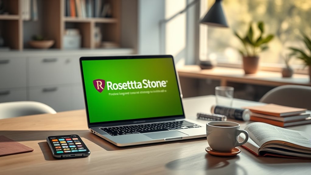 Are your devices compatible with the Rosetta Stone subscription you’re considering? It’s essential to confirm your main devices—whether PC, Mac, iOS, or Android—are supported, so you can access lessons anytime. Check if the platform offers cross-device synchronization, which lets you switch smoothly between your phone, tablet, and computer without losing progress. Also, consider whether you need offline access or if an internet connection is required for your preferred device. Some subscriptions include mobile apps, browser-based lessons, or desktop software, so choose what fits your learning style. Additionally, verify compatibility with any hardware like headsets or microphones needed for speaking exercises. Ensuring device compatibility helps you learn seamlessly, wherever and however you prefer.