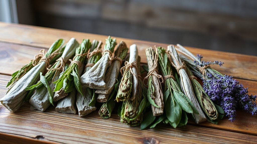 Like a gentle, flickering flame dances in the night, homemade smudge sticks usually burn for about 20 to 30 minutes. I find that their soothing aroma lingers, creating a calming atmosphere. If you want a longer burn, just let it go out naturally or relight as needed. Keep an eye on it, and always practice safety. Remember, like a good story, a smudge stick’s burn can be perfectly timed for your energy space.