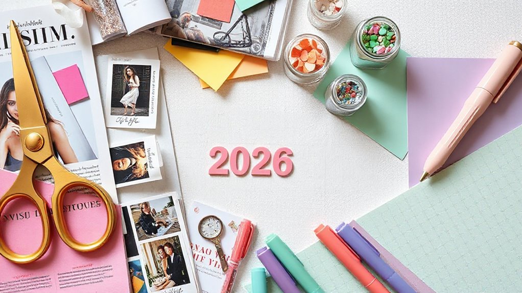 Choosing vision board supplies that are durable and well-made is essential for creating a long-lasting, impactful display. High-quality materials like thick cardstock, sturdy foam boards, and premium adhesive tapes guarantee your vision board withstands handling and repeated updates without tearing or losing adhesion. Reusable options such as slide-in cards or peel-and-stick elements make it easy to modify your board without damaging the base or visuals, saving you time and money. Selecting fade-resistant and waterproof materials keeps your vision board vibrant and intact over time, even in varying environments. Investing in well-crafted supplies not only enhances durability but also makes your vision board more sustainable and cost-effective in the long run. Quality matters if you want a reliable and inspiring visual tool.