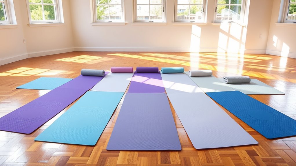 The size of your yoga mat plays a essential role in ensuring comfort and stability during practice. It’s important to choose a mat that provides enough space for your full body to move freely, typically at least 68 inches long and 24 inches wide. If you’re taller or have a wider arm span, look for larger mats to avoid feeling restricted. Consider your workout space, especially if you practice in small studios or confined areas—select a size that fits comfortably without crowding. A properly sized mat also allows smooth progressions between poses, reducing the need to reposition frequently. Ultimately, the right size helps you stay focused and confident, supporting your practice without distractions or discomfort.